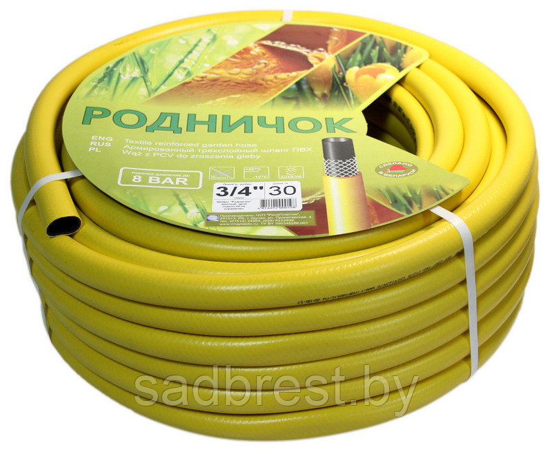 Армированный трехслойный поливочный шланг ПВХ. Стандартный поливочный шланг с сетчатой оплеткой, устойчив к УФ, не трескается, не истирается. Цвет - желтый. Внутренний диаметр 3/4" (19мм) - подходит к штуцеру насосов "Ручеек".